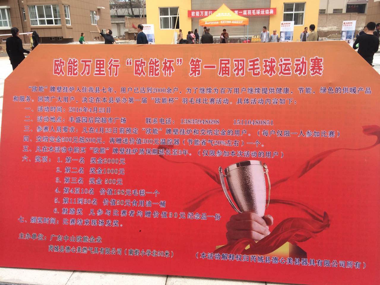 “欧能”牌壁挂炉入住我县七年,用户已达到2000余户,为了继续为百万用户继续提供健康,节能,绿色的供暖产品和服务,回馈广大用户,决定在本县举办第一届“欧能杯”羽毛球比赛活动。